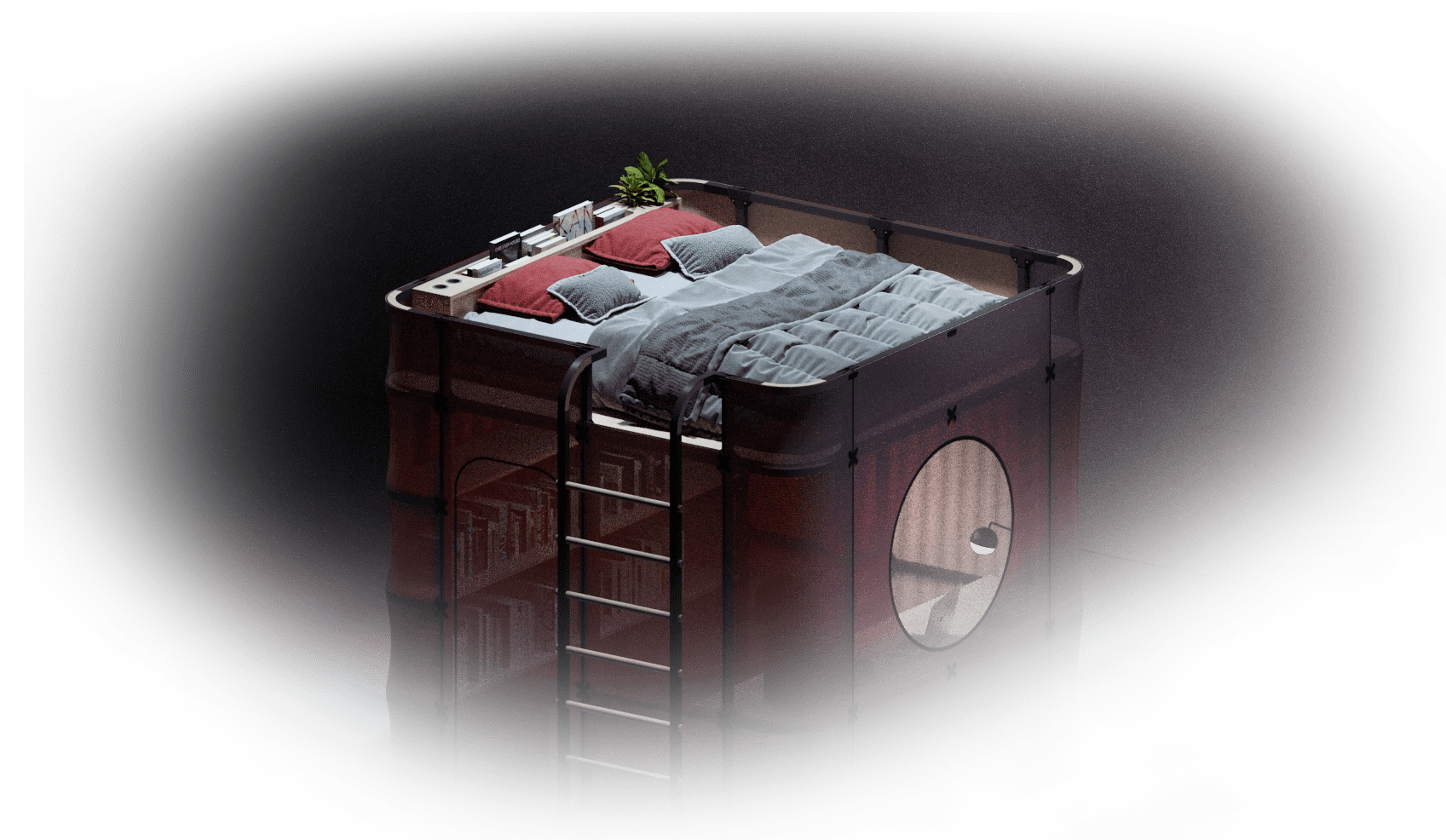 Это больше, чем мебель, это комната в комнате. Гаджет, который организует пространство, он может создать персональное рабочее место с кроватью на втором уровне или игровую кабину.